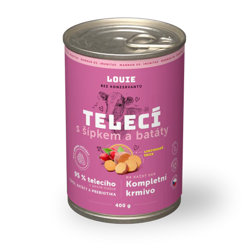 Telecí maso, voda, šípky, batáty, tymián, rozmarýn, probiotika (mannanoligosacharidy/fruktooligosacharidy), minerály a vitamíny. Analytické složky: hrubý protein 10,5 %, hrubý tuk 9,5 %, hrubý popel 1 %, hrubá vláknina 1,4 %, vlhkost 77,6 %.
